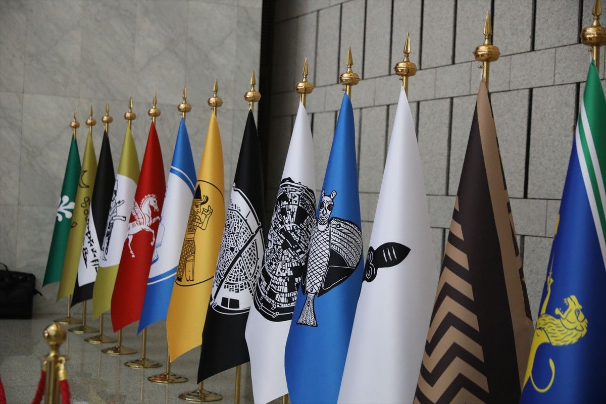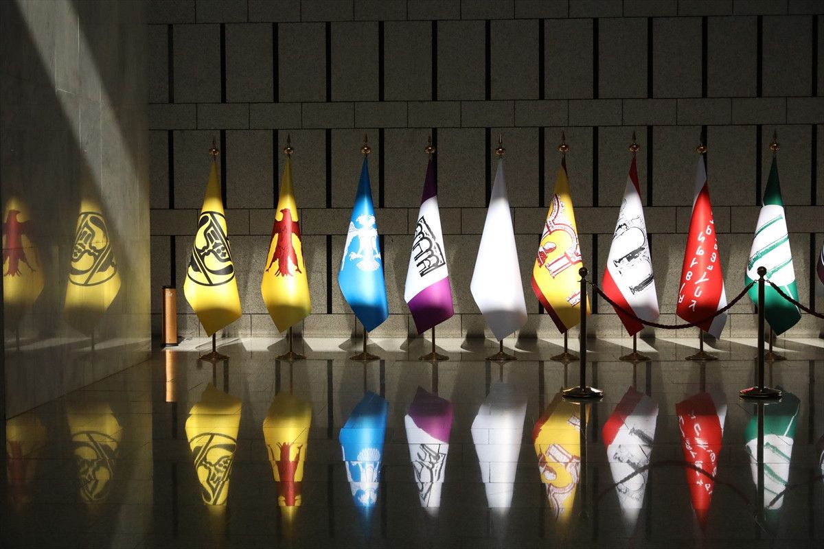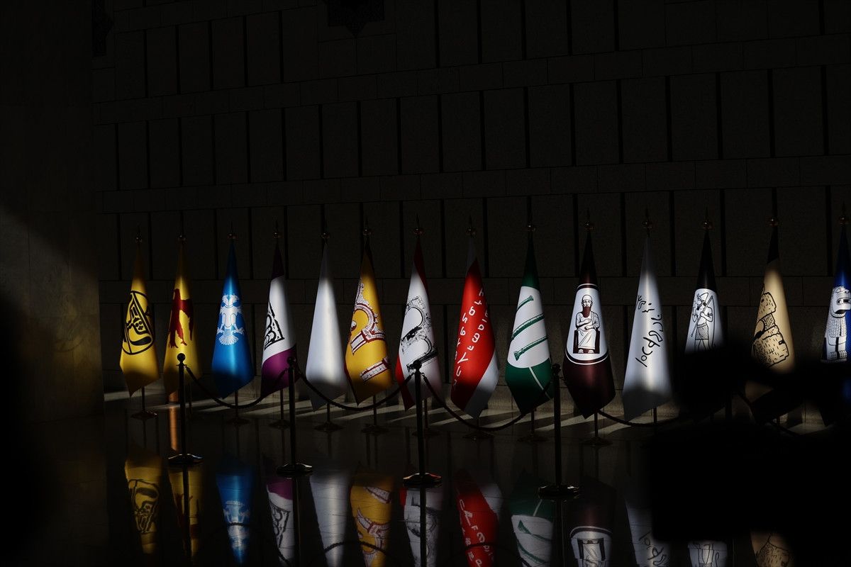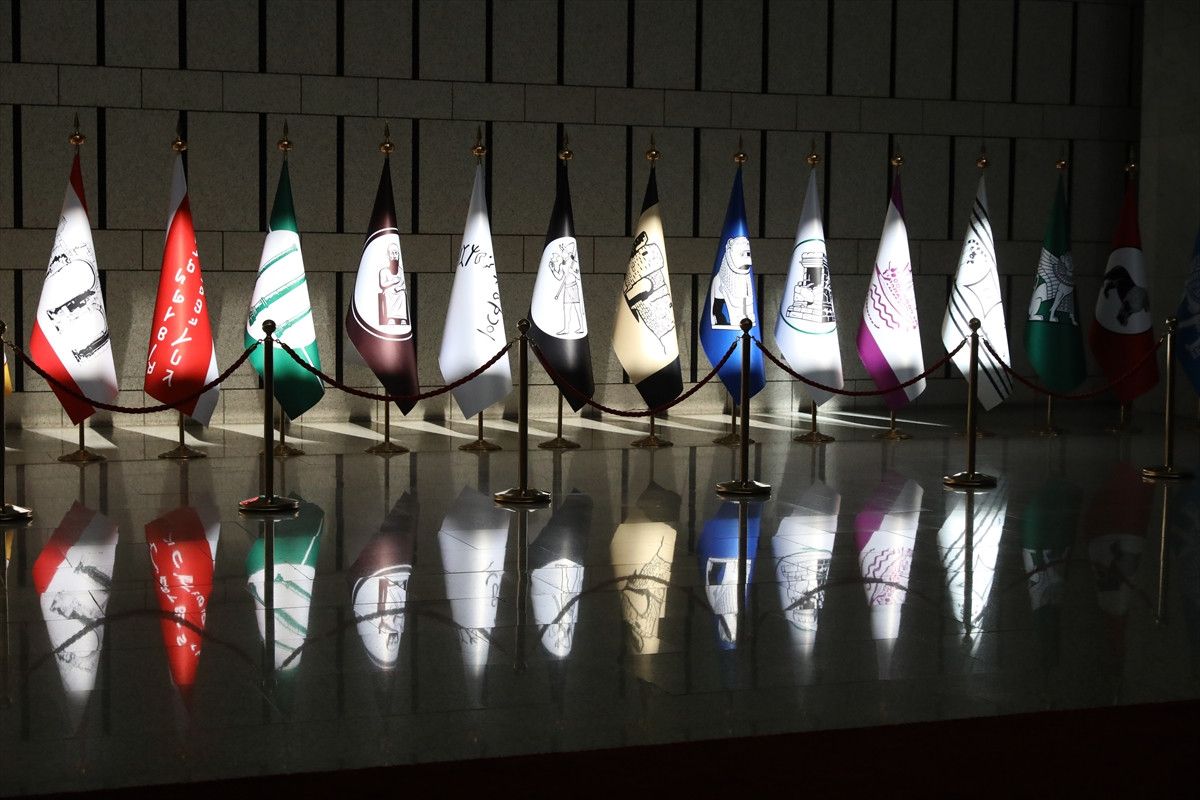 Suriye topraklarında tarih boyunca varlık göstermiş medeniyetleri simgeleyen temsili bayraklar, Şam’daki Cumhurbaşkanlığı Halk Sarayı’nda düzenlenen ortak basın toplantısında sergilendi. Dışişleri Bakanı Hakan Fidan ile Suriye Dışişleri Bakanı Esad Hasan Şeybani’nin açıklama yaptığı salonda yer alan bayraklar, dikkat çekti.